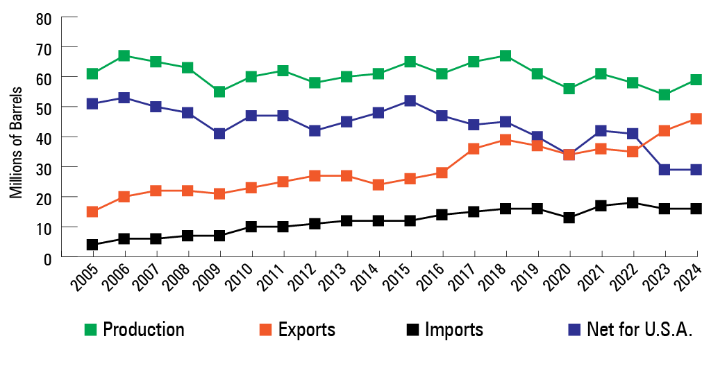 The U.S. and China are by far the world’s two biggest base oil producers. For the past two decades, U.S. output has varied from year to year but trended relatively level. From 2005-2009, production averaged 62.3 million barrels per year, and the annual average for the next two five-year periods was 60 million barrels (2010-2014) and 63.8 million barrels (2015-2019). For 2020-2024, however, the average dropped to 57.6 million barrels.