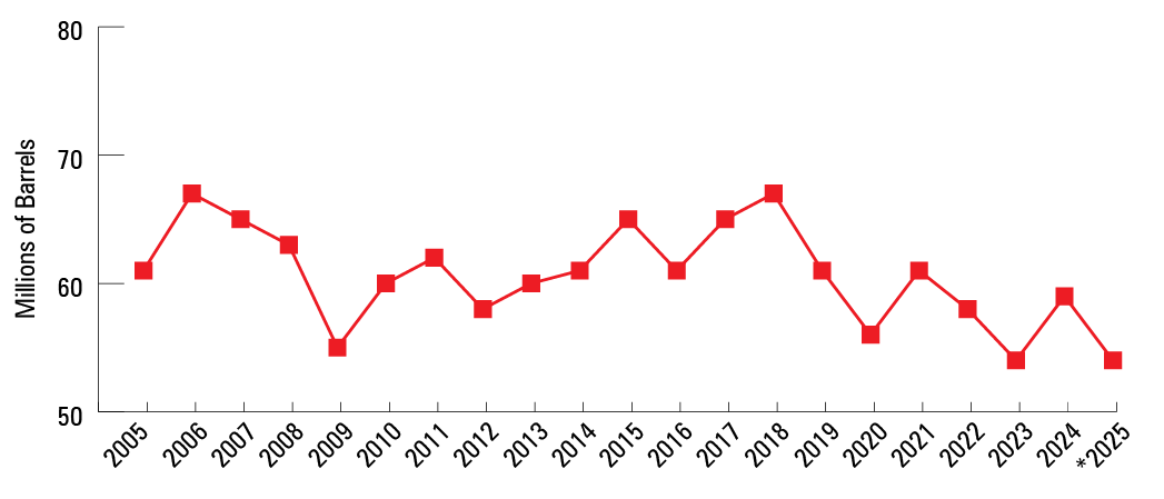 There is no sign of a rebound in 2025. According to data from the U.S. Energy Information Administration, American refiners made 27.2 million barrels from January through June. That was down from 29.2 million barrels in the same period of 2024 and was lower than any year in the past 20 save 2023 and 2009, during the Great Recession. EIA’s base oil production data only goes back to 2005.