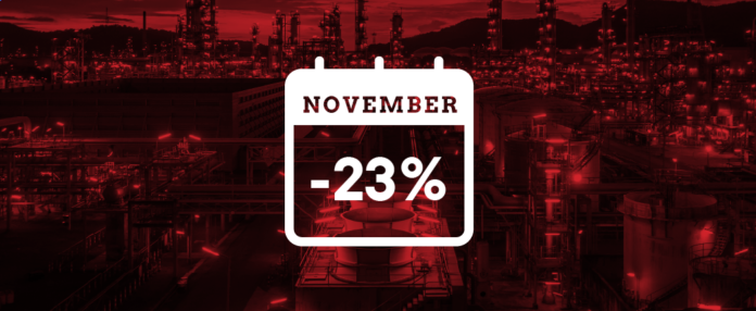 The nation’s production of lubricants, which includes exports, declined to 149,657 kL in November, down 28% from 208,216 kL in November 2019.