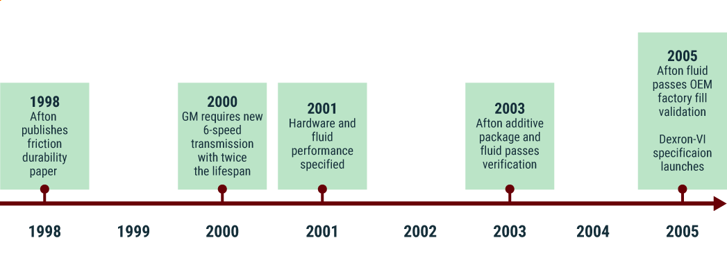 By 2001 collaboration on Dexron-VI had begun in earnest. Unlike for industry specifications, additive companies play the primary role in developing fluids for single OEM specifications, an iterative process that works best in parallel with test development.