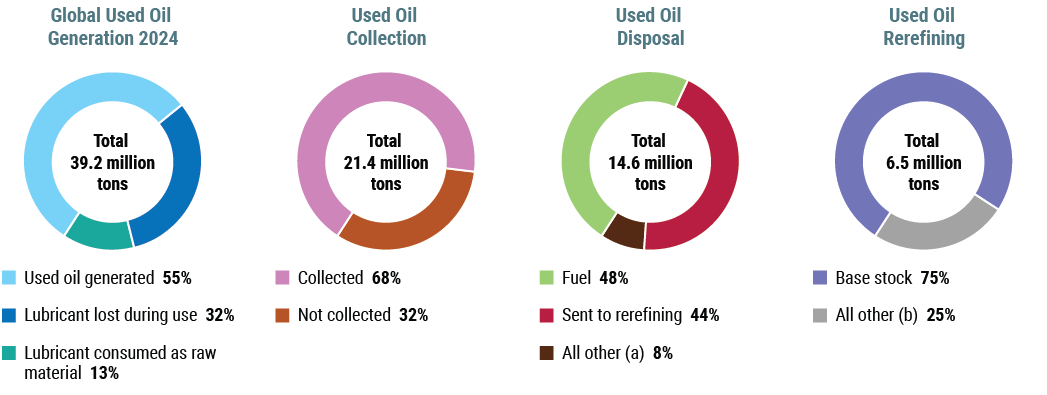 - Generation of used oil is directly correlated with finished lubricant consumption. The higher the quality of lubricants used, the better the quality of the resulting used oil — which in turn enhances the efficiency and yield of rerefining processes, enabling the production of higher quality base oils.