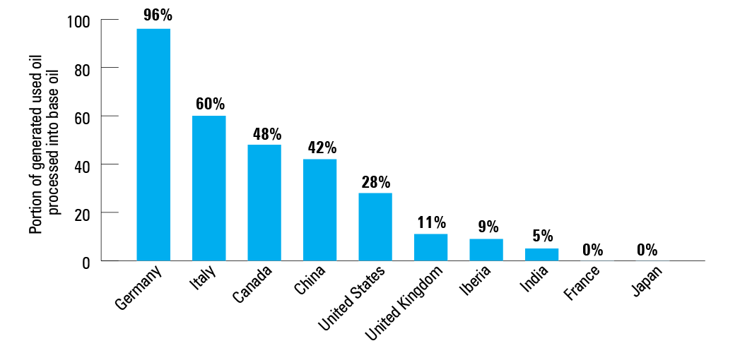 - Leaders: Germany and Italy showcase some of the highest rerefining rates. In fact, Germany even imports used oil to feed its rerefining capacity, while the United States leads in the production and supply of high quality rerefined base oils.