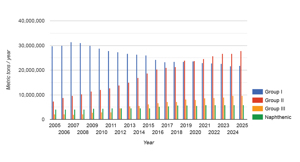 Figure 1. Global Mineral Base Oil Capacity by API Group, 2005-2025