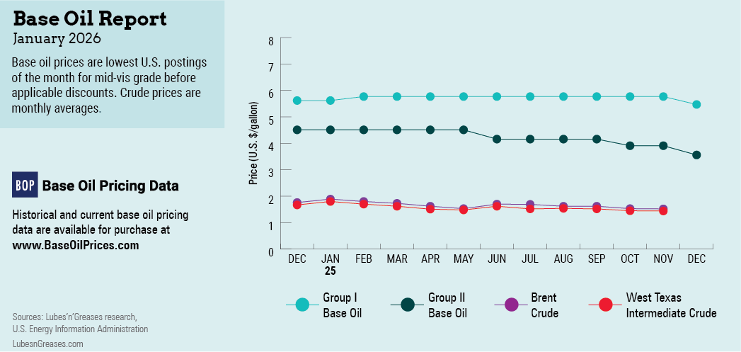 The last month of 2025 certainly reflected this trend as most suppliers faced soft demand and ample inventories, which exerted downward pressure on prices. It came as no surprise, then, that Chevron stepped out with a posted price decrease initiative in early December. The producer lowered the price of its Group II 100R grade by 30 cents per gallon, and its 220R and 600R by 35 cents/gallon on December 2. While no other producers reduced postings at that time, there was plenty of talk behind the scenes about the need for posted price adjustments to better reflect actual market prices. While some participants might be reluctant to disclose private discussions about pricing, others said that postings had always helped determine price direction and seemed to convey transparency to a complicated market picture, allowing buyers and sellers to use these prices as a coherent benchmark during contract negotiations. Some ventured to guess that there may be a general shift in the New Year whereby many producers might revise posted prices to use them more effectively during their contract negotiations.