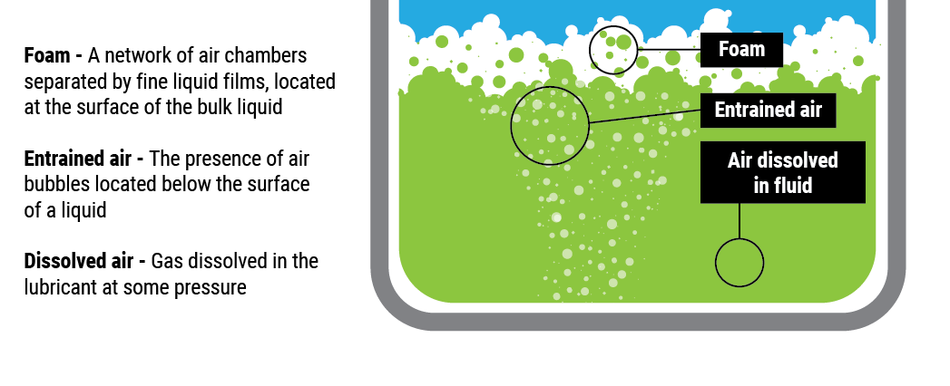 The industry’s combating of aeration has long focused on foaming and use of anti-foam agents or defoamers. Foam is a network of air chambers separated by fine liquid film that usually forms on the surface of bulk liquid. Defoamers are small, insoluble polymeric droplets, created during the lubricant or fluid blending process, which then exist throughout the fluid including in the film between foam air chambers. Droplets in the films deform them, causing the films to stretch until they rupture, releasing air.