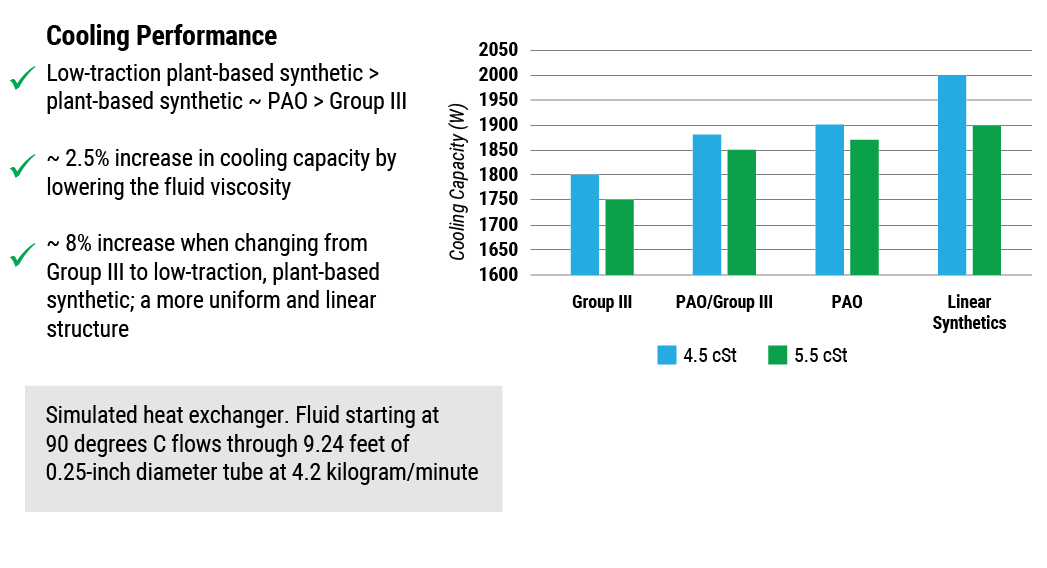Cleveland discussed tests that Afton conducted to compare the cooling and friction reduction capabilities of several categories of base stocks: Group III; two types of synthetics, which were polyalphaolefins and a second derived from plant sources; more linear synthetics, which were metallocene PAO and a low-traction variety of the plant-based stock; and a PAO-Group III blend.