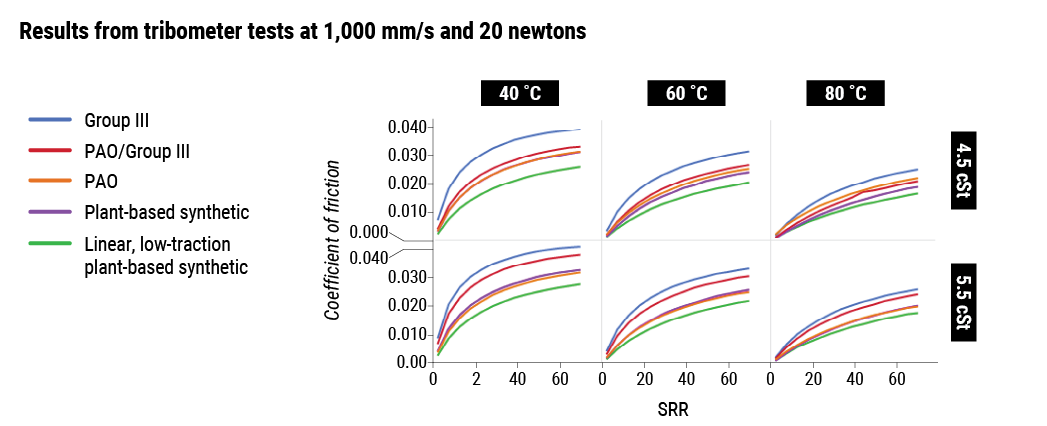 Friction coefficients were compared using a bench test applying 20 newtons of pressure at 1,000 millimeters per second, run at three different temperatures — 40 degrees, 60 degrees and 80 degrees. Overall, the low-traction plant-based synthetic performed best, followed by PAO, the other plant-based synthetic and Group III.