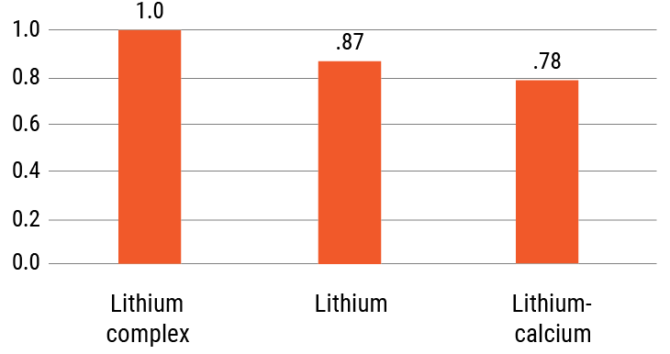 Complex lithium thickeners are usually required at higher concentrations than conventional lithium, so levels in the test batches varied — from 7% for one of the conventional lithium batches to 12.9% for one containing complex lithium.