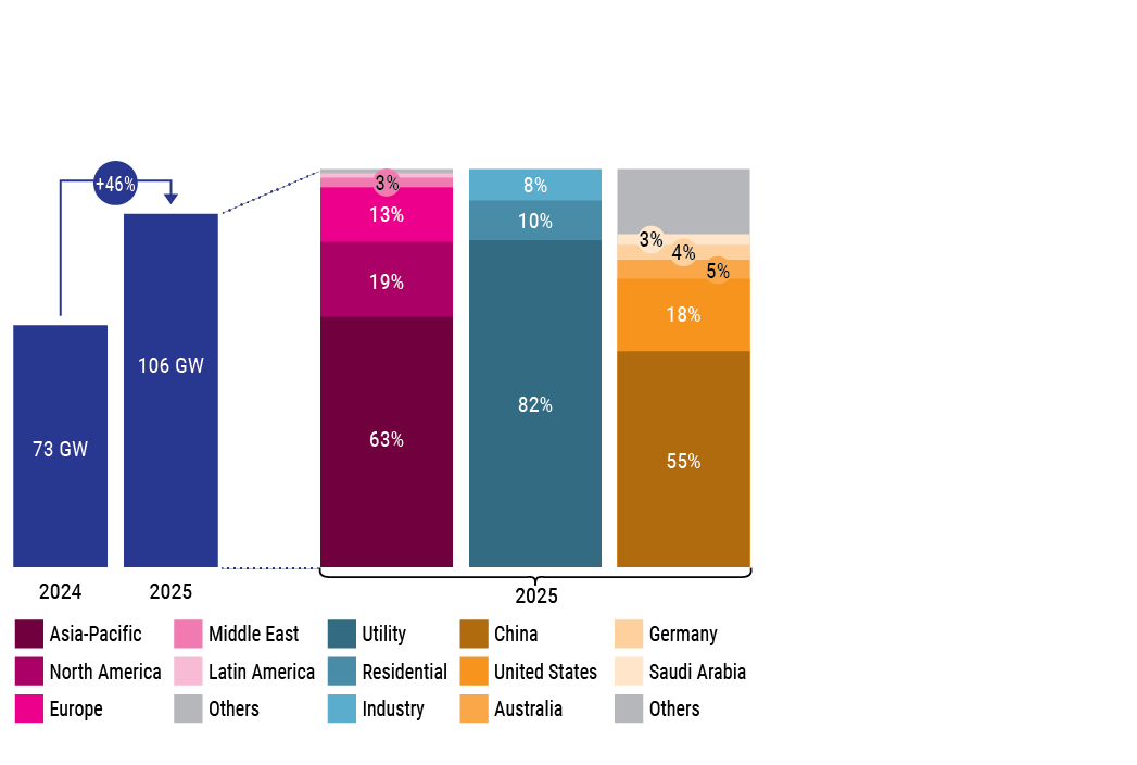 Annuall installations for energy storage surpassed 100 GW for the first time in 2025. Wind and solar installations crossed that milestone in 2009 and 2017, respectively.